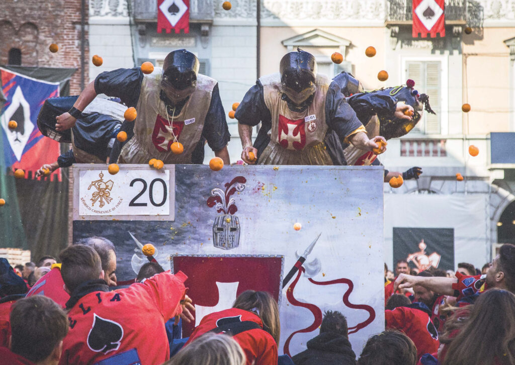Nel cuore del Piemonte, il Carnevale di Ivrea si trasforma in un campo di battaglia… a colpi di arance. Non è solo folklore: la rievocazione simboleggia la rivolta del popolo contro un tiranno medievale.