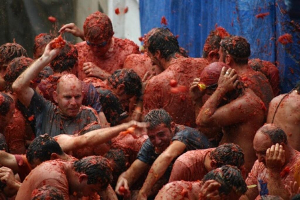 Ogni agosto, a Buñol, migliaia di persone si lanciano pomodori maturi in una gigantesca battaglia collettiva. Nata quasi per caso da una lite negli anni ’40, oggi è una festa ufficiale che attira visitatori da tutto il mondo.