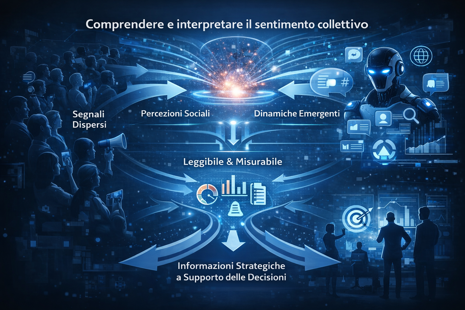 trasformare l’opinione pubblica, il sentiment diffuso e le dinamiche emergenti in informazioni strutturate, leggibili e strategicamente utilizzabili.