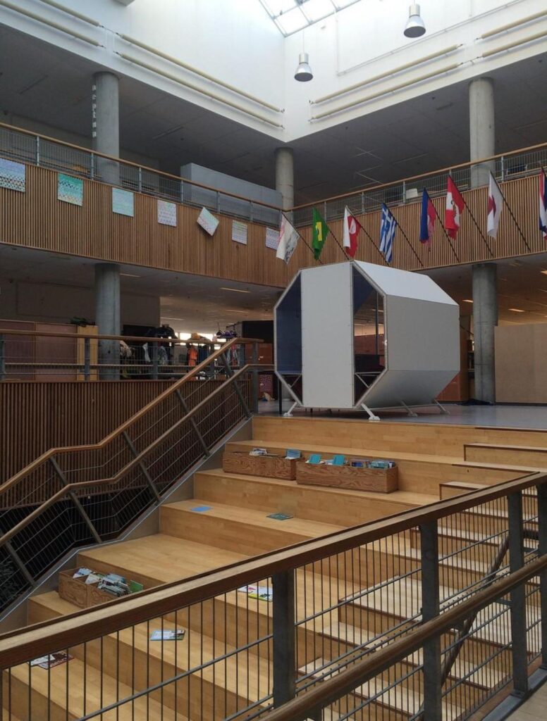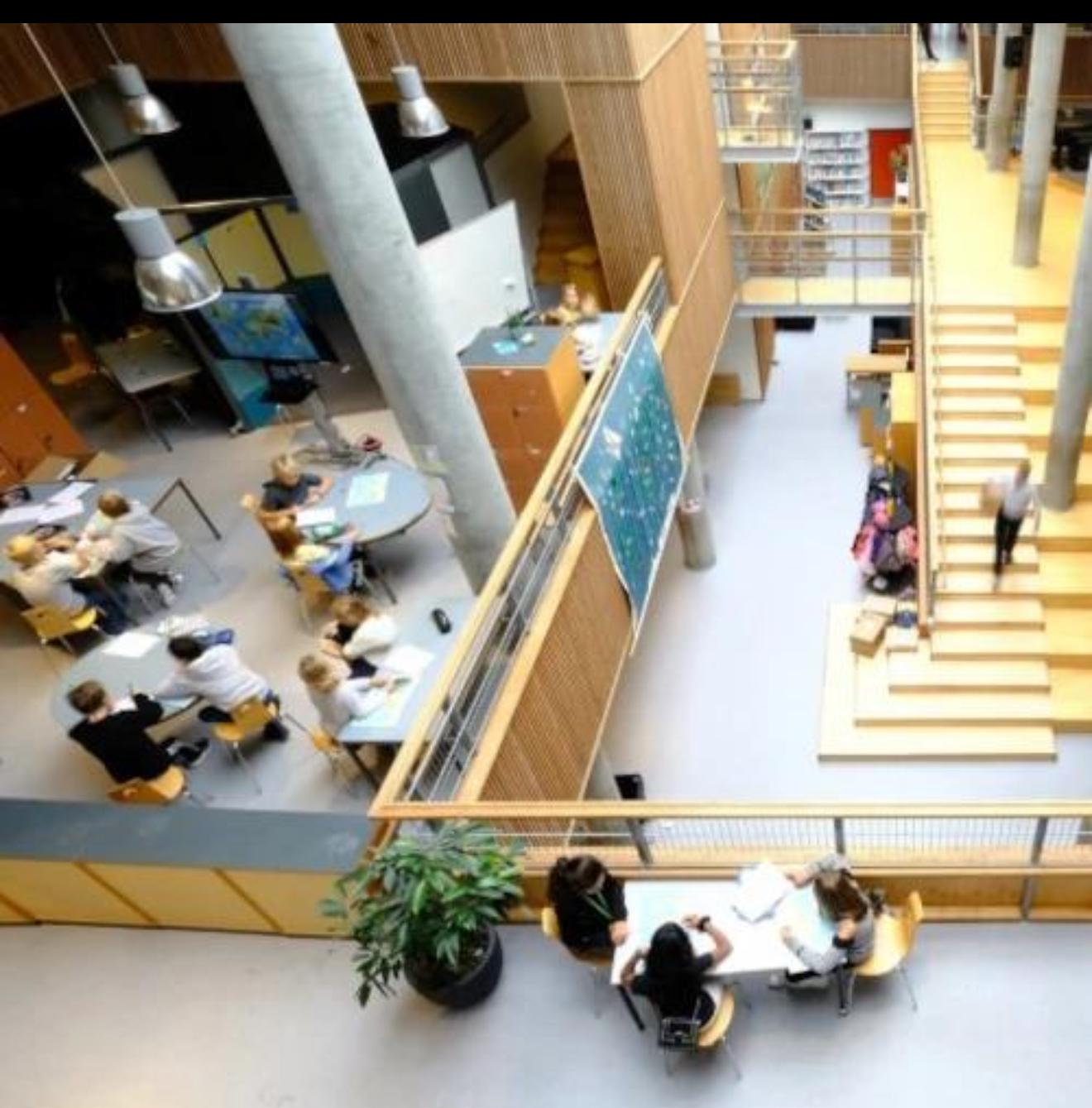 L’edificio non somiglia a una scuola tradizionale. Gli spazi sono aperti, fluidi, trasformabili. Non ci sono file di banchi né aule chiuse: ci sono gradoni, cuscini, tavoli condivisi. Gli studenti si muovono, scelgono, collaborano. Eppure non regna il caos, ma una calma sorprendente, come se ogni angolo fosse progettato per far sentire chi lo abita al posto giusto.